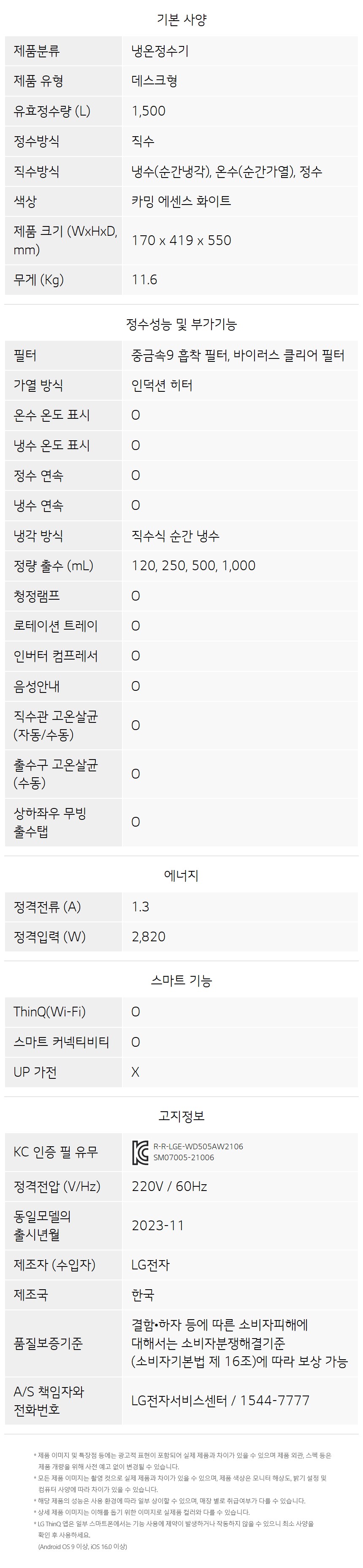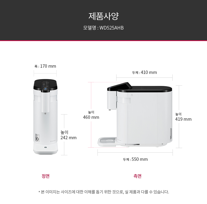 제품 크기170 X 419 X 550 mm (Tray 제외 시 D : 410 mm, 상단 조작부 포함 시 H : 460 mm)